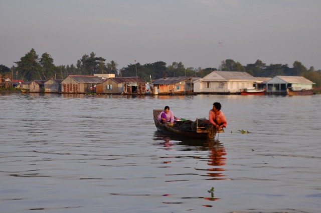 Après une soirée dépourvue d’intérêt – Chau Doc est une ville de bordure tout ce qu’il y a de plus ordinaire, de plus il y fait une chaleur étouffante -, nous retrouvons Kun au lever du jour pour aller au port. Il nous a réservé une dernière surprise: de petites carrioles tirées par des chevaux nous attendent devant l’hôtel ; on y entasse difficilement nos énormes valises et nous voilà partis dans la fraîcheur du matin.