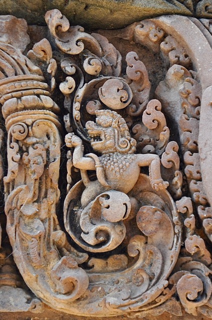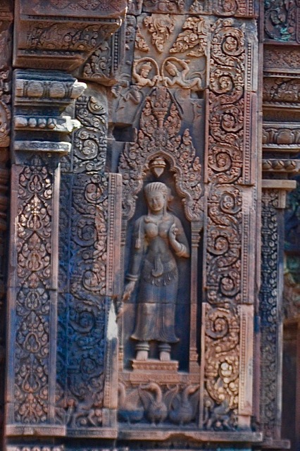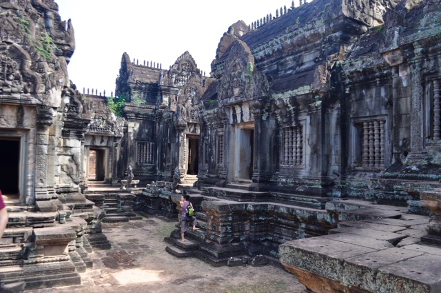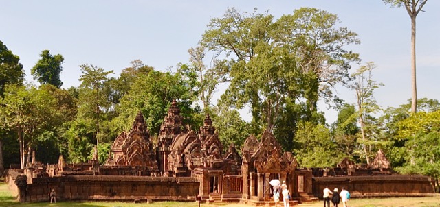 A 40km d’Angkor Thom se trouve le très célébre “Ladies temple”, surnommé ainsi par les explorateurs qui furent tant séduits par sa beauté qu’ils crurent qu’il avait été construit par des femmes. Ce ne serait vraisemblablement pas le cas, ce qui ne l’empêche pas d’être un véritable écrin à bijoux, tout rose et recouvert entièrement de bas reliefs et sculptures d’une finesse incroyable, creusés plus profondément que dans les autres temples c’est presque de la 3D.