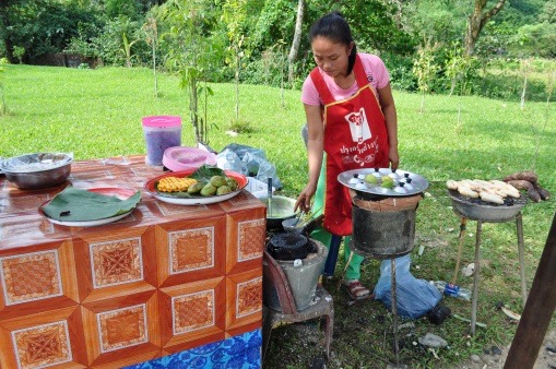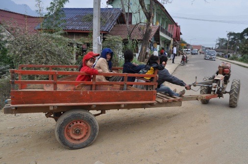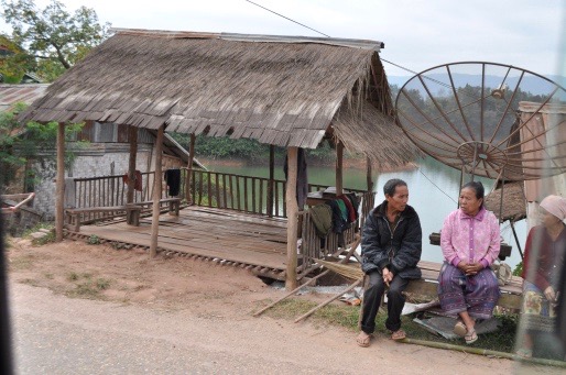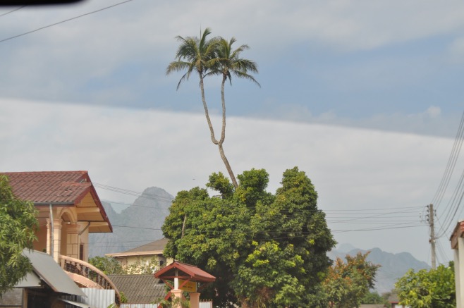 8 o’clock departure from Vientiane direction Vang Vieng. During this 3-4 hour car drive, the landscape changes from really flat to small sharp-edged mountains. Villages are tiny and rather unpopulated; our new guide explains with his vague English that even though they are connected to power they do not have running water, and do not need it because of the numerous mountain streams.