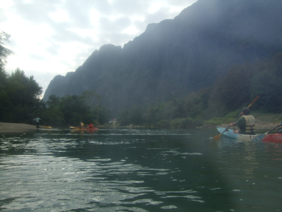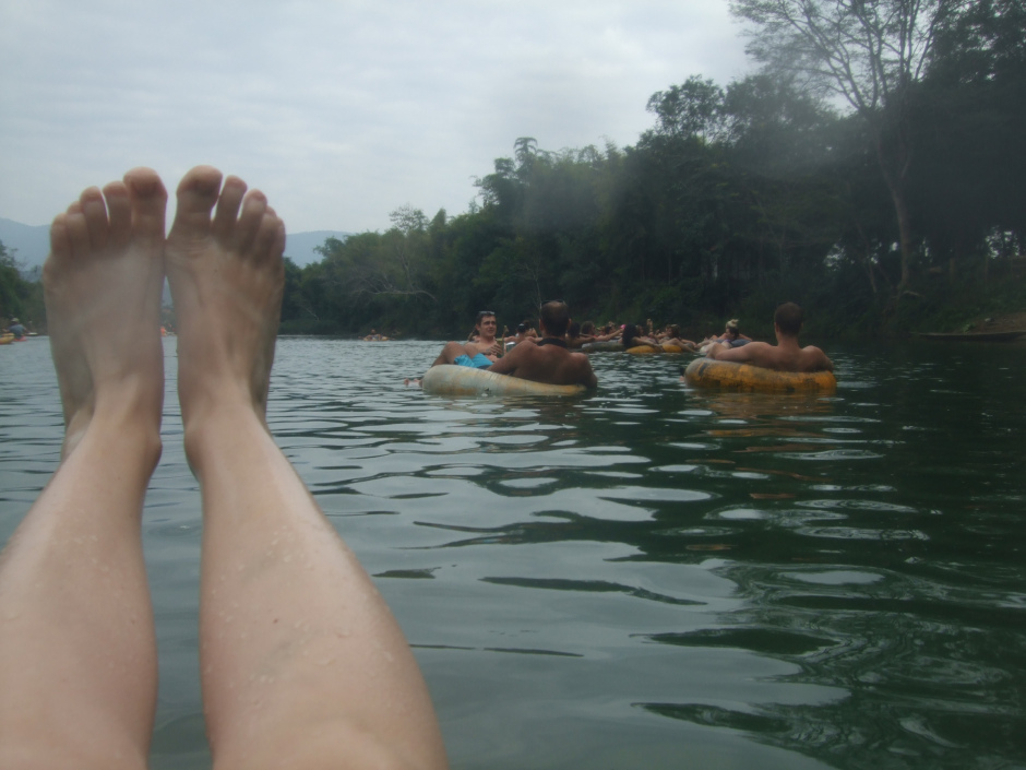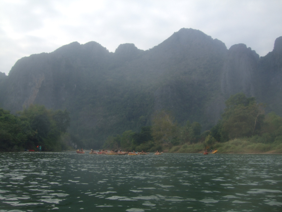 Tubbing was the most popular activity in town: a bus takes tourists upriver which they then ride down floating on a tractor’s inner tube. Theoretically, this sounds like a perfect way to enjoy the stunning scenery. The problem was that shores quickly lined up with pubs and bars offering cheap drugs and alcohol, along with monkeys ropes to go from one side of the river to the other. Strangely enough, it quickly turned out that drugs andWATERSPORTS do not mix: a lot of accidents occurred, often leading to deaths. Over the past 6 months, 9 tourists died (4 europeans and 5 australians), prompting authorities to take security measures: drugs were forbidden and bars were forced to close. A policeman LATER TOLD US that he had recently arrested a group of six friends smoking MARIJUANA and that it had cost them a hefty 600 dollars FINE. The atmosphere has therefore changed quite a lot and we discover a Vang Vieng so calm it comes across as ghostly.