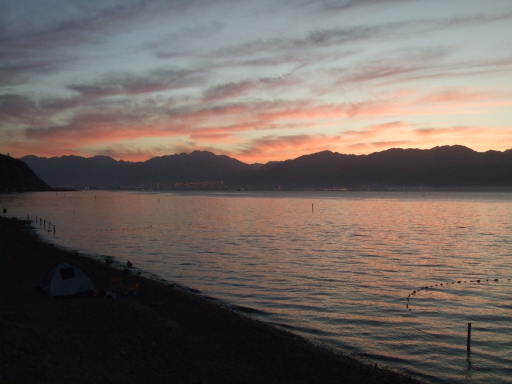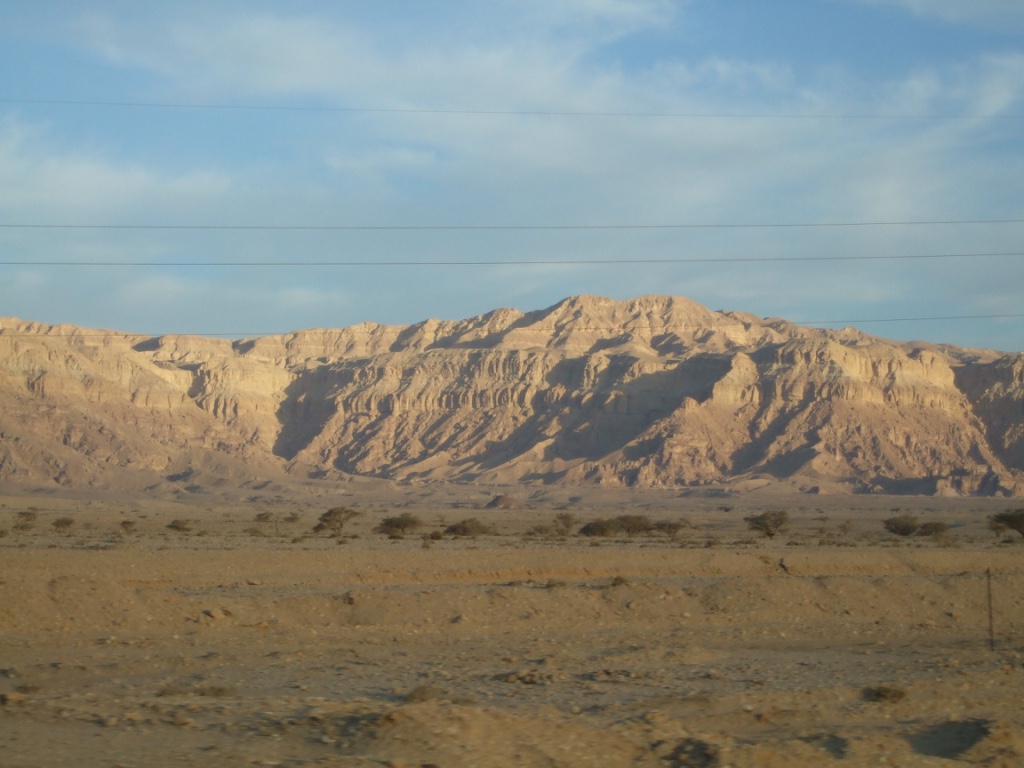 Jérusalem! Départ à 3h30 du matin, laborieuse traversée de la frontière avec l’Israël ; une fois de l’autre côté, c’était le lever du jour, magnifique de nuances or et roses tel un tableau de Turner, sur les montagnes de Jordanie. Je n’ai finalement pas regretté de m’être levée tôt. Trois heures de route vers la mer morte, dans une vallée qui, ayant été un ocean il y a quelques millions d’années, avait creusé ce qui avait été de hautes montagnes en des formes extrêmement variées.