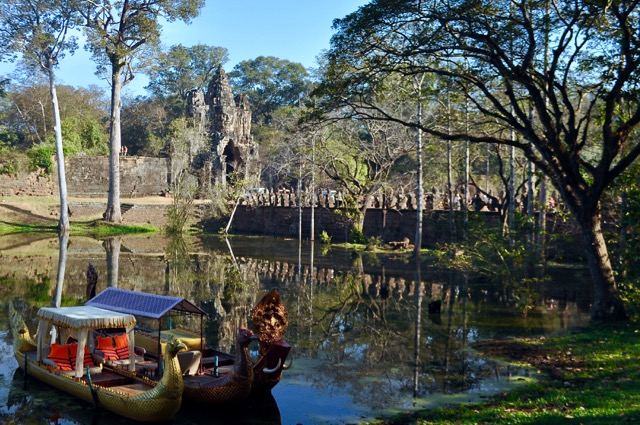 Nous arrivons à une des portes de la ville, la mieux préservée, c’est fou comme c’est beau. Au bout d’un pont bardé de 54 statues de chaque côté : les dieux à gauche et les démons à droite, tenant la queue du serpent sacré le « Naga », se trouve une gigantesque porte surmontée de la figure souriante de Boudha coiffée de fleurs de lotus.