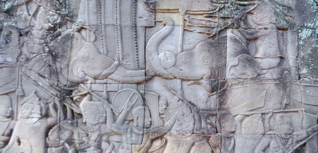 Les Chams (ceux avec un casque sur la frise ci dessus), que nous avons croisés au Vietnam dans le site My Son Holyland, prirent la ville pendant quelques décennies, avant de se faire virer. Des rois d’influence hindoue se sont également retrouvés à la tête de l’empire. Cependant, plutôt de détruire les temples (tel un vilain Henri VIII qui fit brûler plein de très belles abbayes ici en Angleterre), ils se contentèrent de transformer deux trois trucs, ce qui est assez marrant. Par exemple, ils ont ajouté un troisième œil sur le front de Bouda pour le transformer en Shiva.
